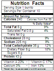 Yield: 10 servings Serving Size: 1 burrito Source:BWH Food Service