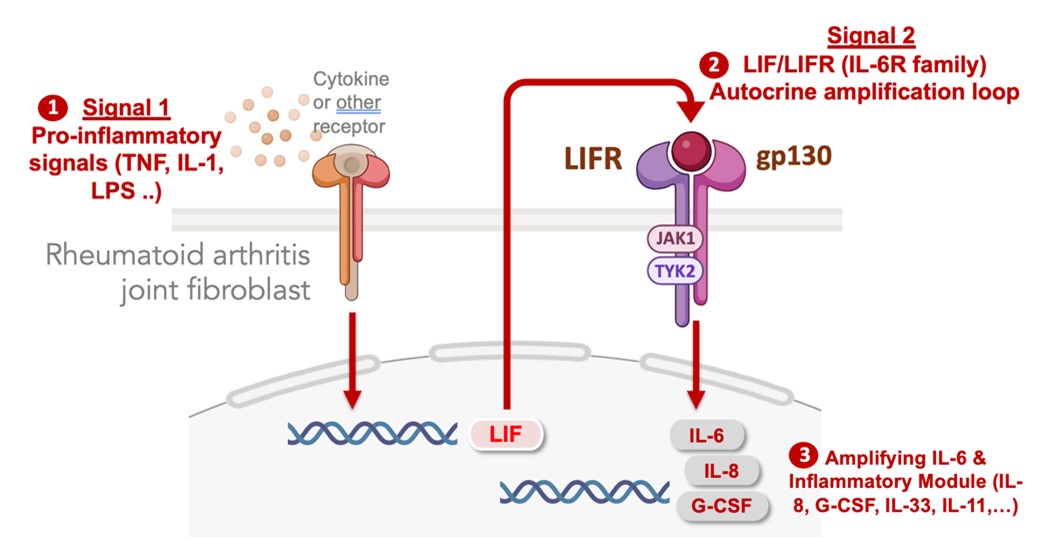 In identifying the pathways that activate stromal cell populations in autoimmune diseases, we defined signal specific gene expression modules in fibroblasts that regulate their secretion of IL-6 in chronically inflamed tissues. IL-6 is part of a larger program of inflammatory factors and transcription factor regulators that are co-expressed as an inflammatory module dependent upon an autocrine feedback loop mediated by cell surface IL-6 receptor family member, leukemia inhibitory factor receptor (LIFR). No matter what exogenous factors activate fibroblasts (e.g. TNF, IL-17, IL-1, LPS) the full activation response is dependent on autocrine induction of LIF which acts on the LIFR to profoundly amplify the activation response. Blocking the LIF-LIFR axis prevents fibroblast activation across a range of stimuli. We are now targeting autocrine amplification pathways in therapeutic approaches to block fibroblast-induced inflammation, fibrosis and tissue damage.